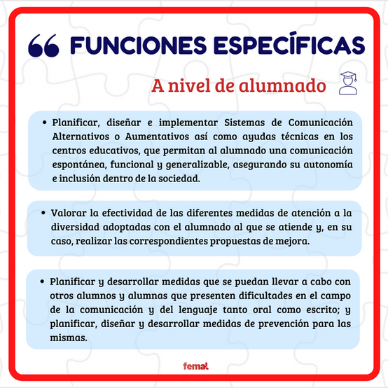🔸Especializado = poseemos un conocimientos específicos para prevenir e/o intervenir en las dificultades comunicativo-lingüísticas del alumnado, asesoramos y colaboramos con el profesorado y familias en cuestiones referidas a la atención a la diversidad, etc.
